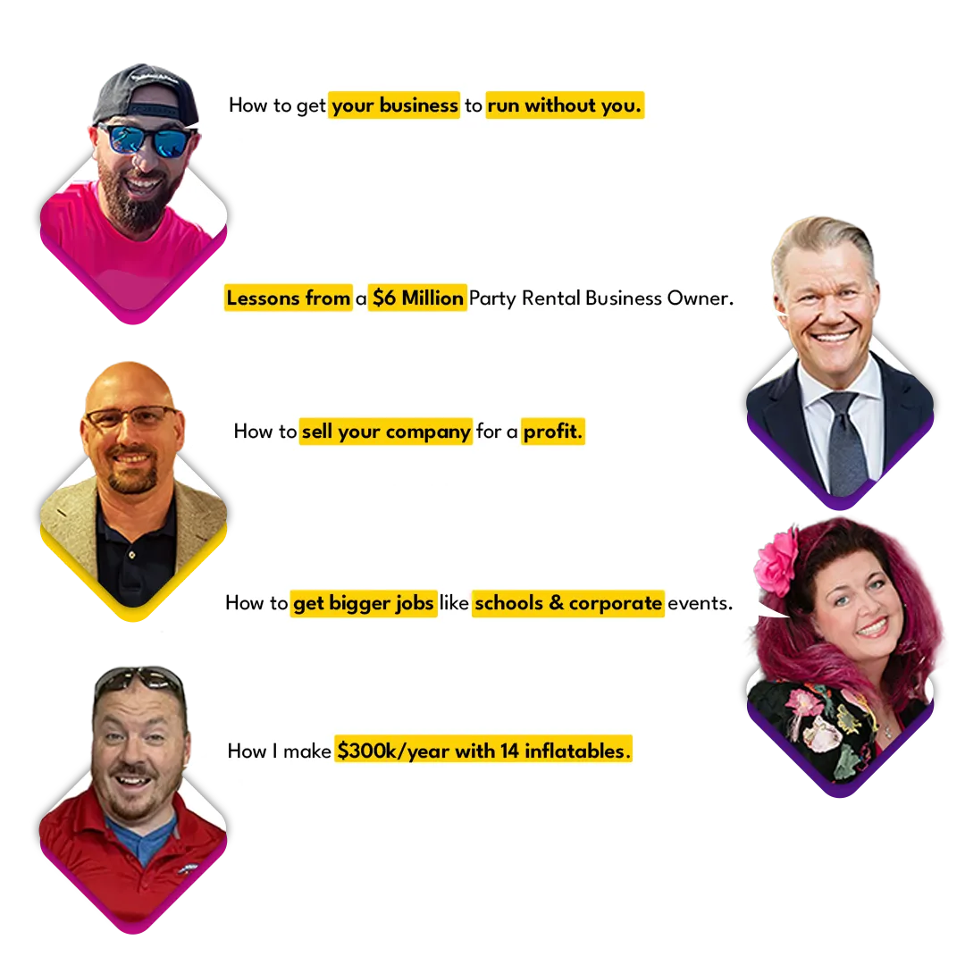 Leave with a small circle of serious party rental owners you can call or text for 1‑on‑1 help on pricing, staffing, and big decisions… instead of sifting through 200 conflicting opinions in a Facebook group.